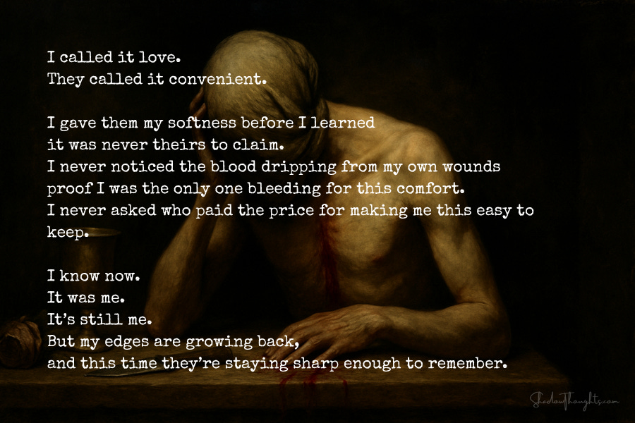 Some of us don’t break loudly. We do it slow, one skipped boundary at a time, one forced laugh swallowed down like cheap wine, one gentle betrayal dressed up pretty and called compromise so we can sleep at night. I mistook being picked for being seen. I mistook belonging to them for belonging to myself. I carved off every sharp edge, bit down every word that might splinter their calm, made my mouth a soft place so they’d never feel my bite. I called it love. They called it convenient. I gave them my softness before I learned it was never theirs to claim. I never noticed the blood dripping from my own wounds proof I was the only one bleeding for this comfort. I never asked who paid the price for making me this easy to keep. I know now. It was me. It’s still me. But my edges are growing back, and this time they’re staying sharp enough to remember. Now when I touch the mirror, I say: Pick him first. Every time. Pick him first, even if it means they flinch when the softness turns back to teeth.