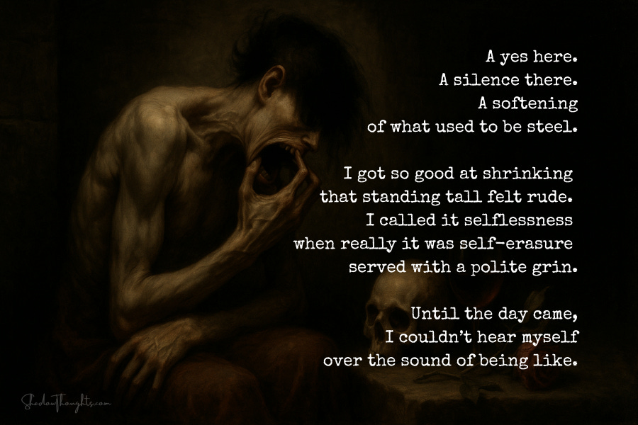 No one notices how small you’ve gotten until you can’t find your own voice under the weight of being good. This is how I disappeared, one polite inch at a time.