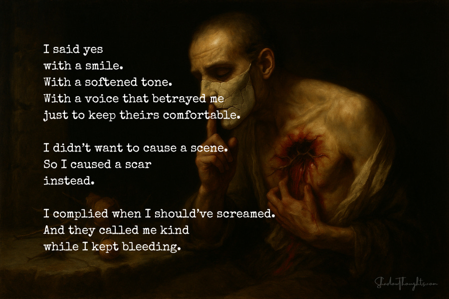 I said yes with a smile. With a softened tone. With a voice that betrayed me just to keep theirs comfortable. I didn’t want to cause a scene. So I caused a scar instead. I complied when I should’ve screamed. And they called me kind while I kept bleeding. If I could go back, I’d teach my mouth how to roar before I taught it how to please.